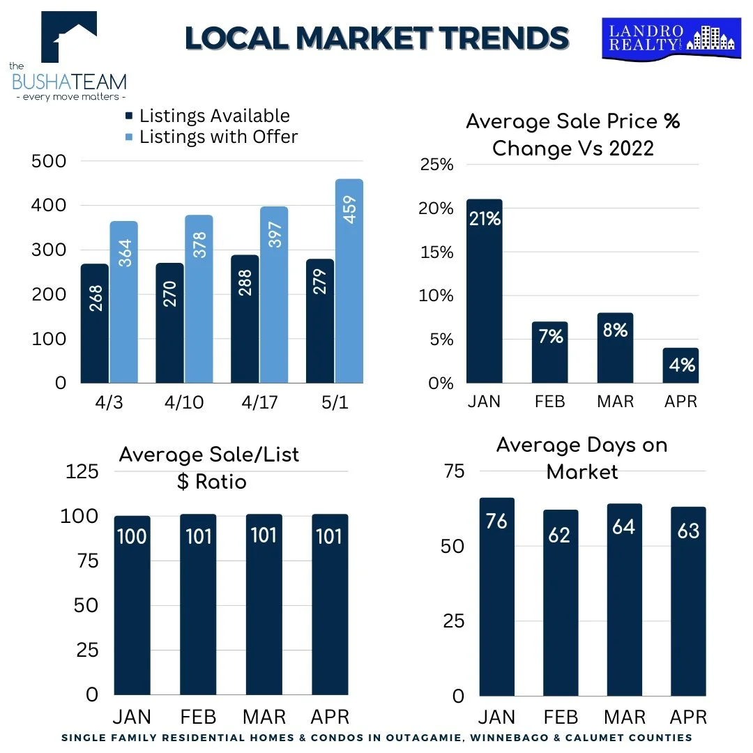 In Outagamie, Winnebago and Calumet Counties April brought a modest increase in sale price of 4% over April of last year. Homes listed near or below the average sales price remain very competitive from the Buyer side, with multiple offers and over-asking prices being the norm for accurately priced listings. Above the average, some more popular listings are seeing the same type of interest, while others are selling closer to or sometimes below list price.